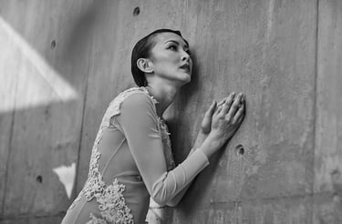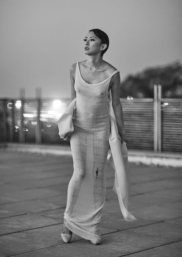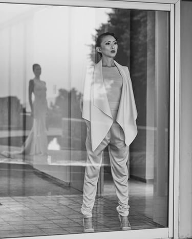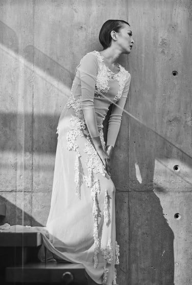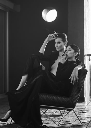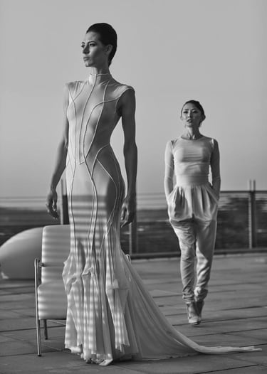 Elizabeth Lotz (Liz Lotz) art director fashion editorial in architectural landscape with two models in black and white elegan
